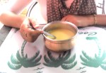 As we waited to place the order, the waiter came and placed two copper-plated glasses on the table. The entire meal was served in traditional utensils and the staff was also dressed in traditional attire adding to the over-all ambiance. Not very hungry, but craving something warm, we started by ordering a Kozhi Nalikeram Rasam, a chicken soup with a base of coconut milk, spiced generously with turmeric, cinnamon, clove and pepper.